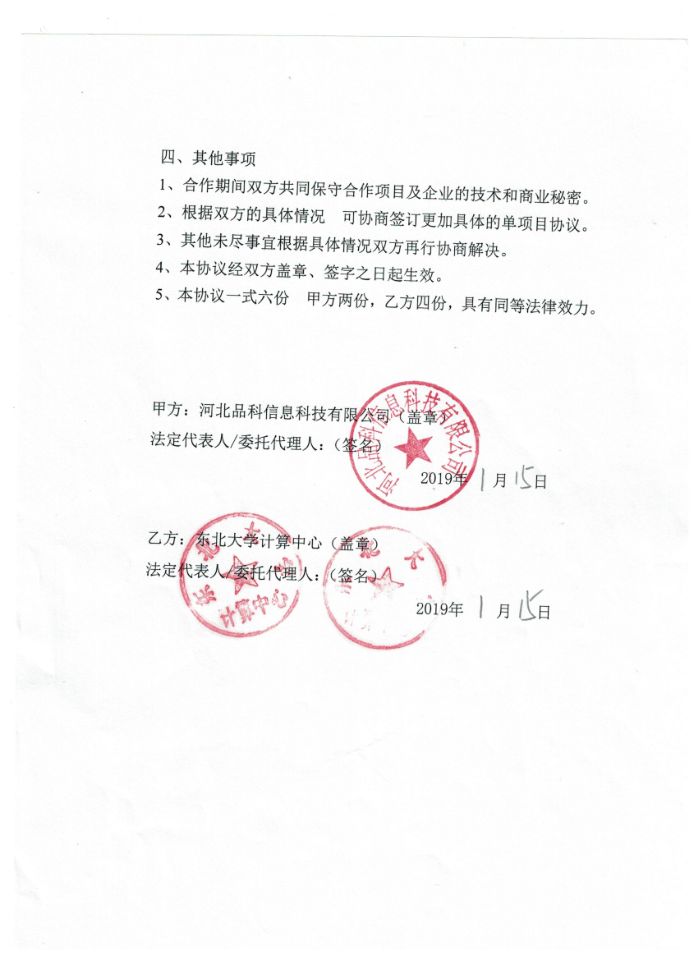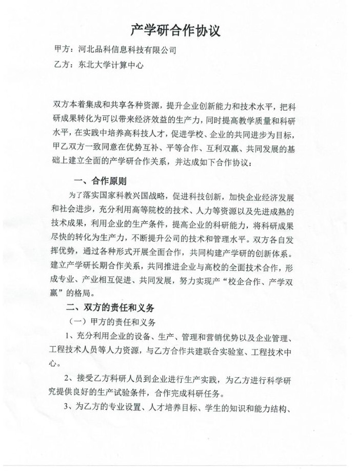 2019年1月15日,河北品科信息科技有限公司與東北大學(xué)計(jì)算中心成功簽訂“產(chǎn)學(xué)研合作協(xié)議書(shū)”,雙方本著服務(wù)企業(yè),滿足產(chǎn)業(yè)需求,提高教學(xué)質(zhì)量和科研水平,集成各類資源,提升創(chuàng)新能力為目標(biāo),經(jīng)共同協(xié)商,一致同意在互惠互利、共同發(fā)展的基礎(chǔ)上建立全面的產(chǎn)學(xué)研合作關(guān)系,實(shí)現(xiàn)優(yōu)勢(shì)互補(bǔ),合作雙贏,一致同意達(dá)成此份協(xié)議。此次“產(chǎn)學(xué)研合作協(xié)議書(shū)”的成功簽訂,預(yù)示著我司在發(fā)展的道路上又前進(jìn)了一大步。